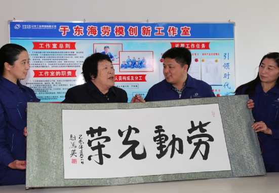 ——在公司热处理分厂于东海劳模创新工作室里,有这位耄耋之年的前辈亲临传授教诲,并亲笔题写“劳动光荣”四个大字;